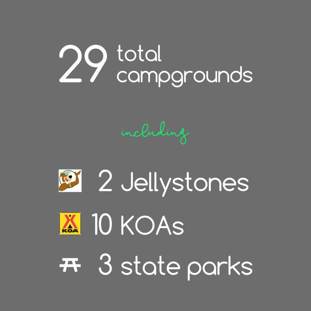 Of the 29 campgrounds we stayed in, 2 of them were Jellystones, 10 were KOAs, and 3 were state parks.