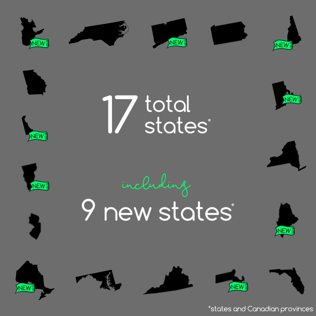 This year, we camped in 17 states. Of those, 9 were states we had never been to with the RV. The asterisk in the graphic is there because when we say “states,” we actually mean “states and provinces.” Two of the 17 are Canadian provinces.