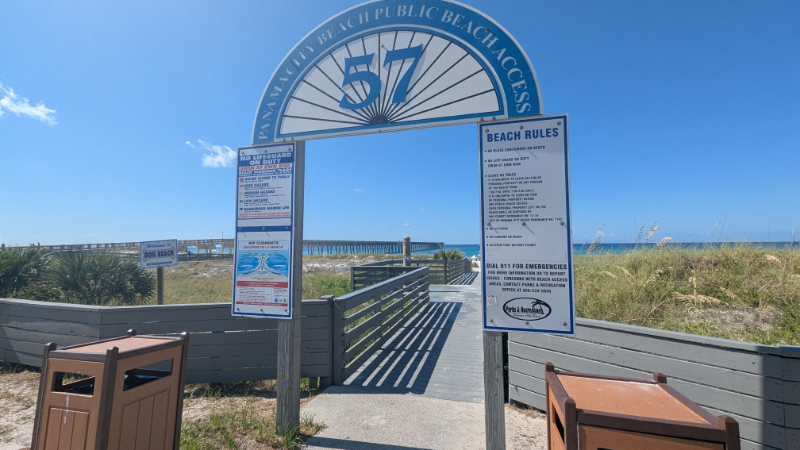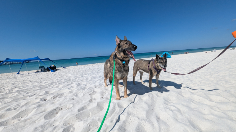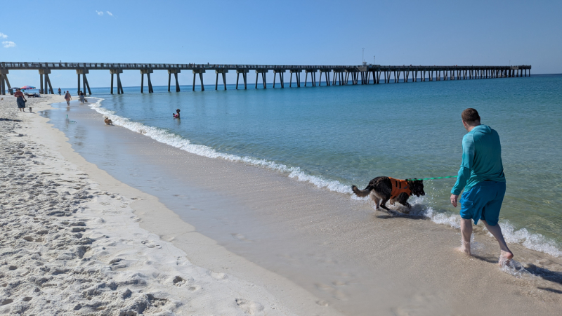 The dog beach is on the west side of the Russell-Fields Pier in Panama City Beach. It’s a very short section of beach where dogs are allowed, but there were minimal waves, and the water stayed just a few feet deep for a good distance.