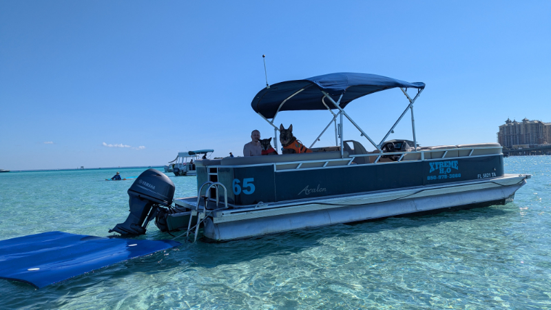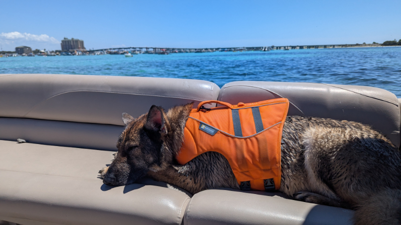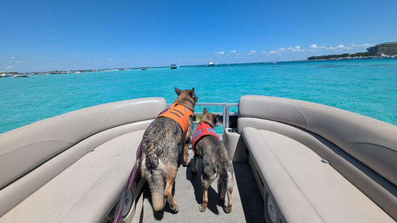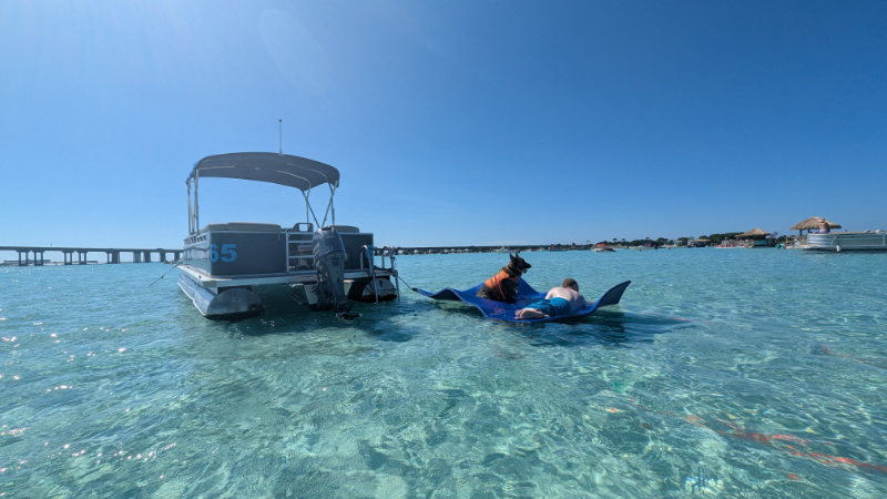 We rented a dog-friendly pontoon boat so we could visit Crab Island with Aiken and Corona. Aiken took to boat life so much better than I expected! He walked on the boat like he’d done it dozens of times before. He hopped up on the couch and made himself comfortable for the ride.