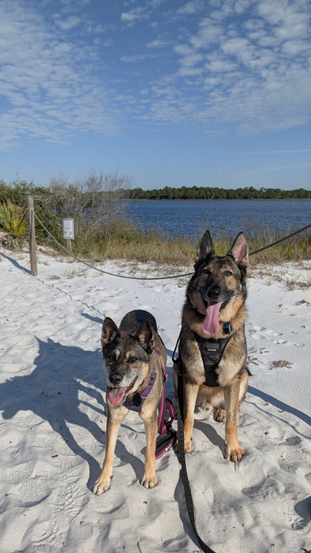 The dogs are not allowed on the beach; however, there is a spot with access to Western Lake. At the back of the parking lot, there’s a short stretch of boardwalk that leads to a small picnic shelter. Western Lake is about 20 feet from the other side of the picnic shelter, so the dogs got a chance to get their feet wet.