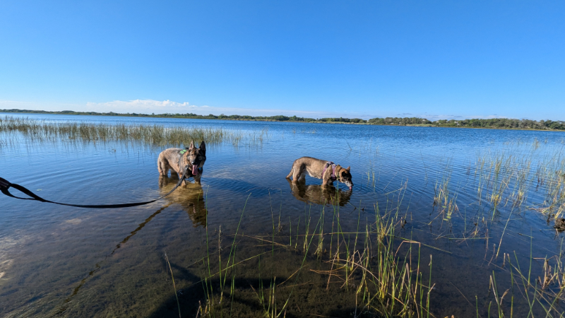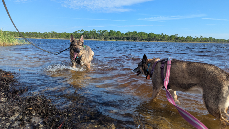 Because of the chance of alligators, we didn’t want the dogs to wade too far out. The water was pretty clear, and we found a spot with minimal vegetation.