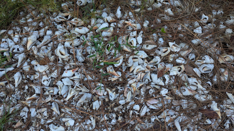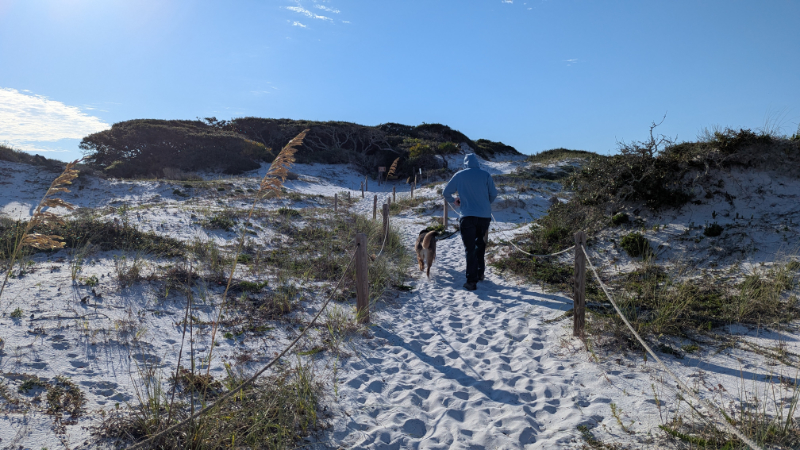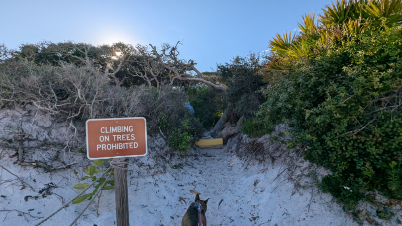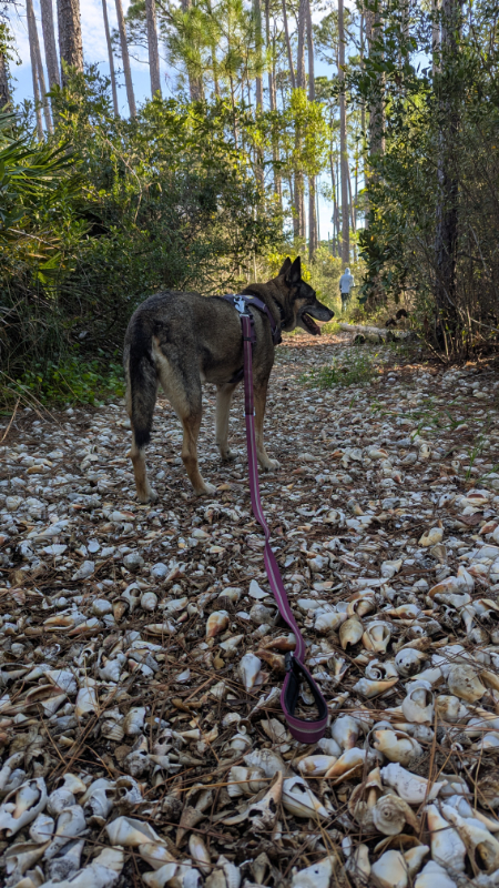 The shaded sections of trail were easier since the terrain wasn’t the soft beach sand. For one short section, the ground was covered in broken shells. We don’t know if they got there naturally or were added as the beach alternative to gravel. Either way, Corona did not enjoy walking on them.