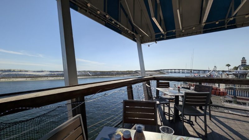 Everything tastes better when you’re sitting at a table on a covered patio with a view of Destin Harbor, not that the burgers and fries needed any help in that department. The food was delicious, and it was fun to watch the birds and the boats go by. The only problem was that the sun comes on the patio at that time of day. Most of our table was shaded when we sat down, but the sun quickly overtook it.