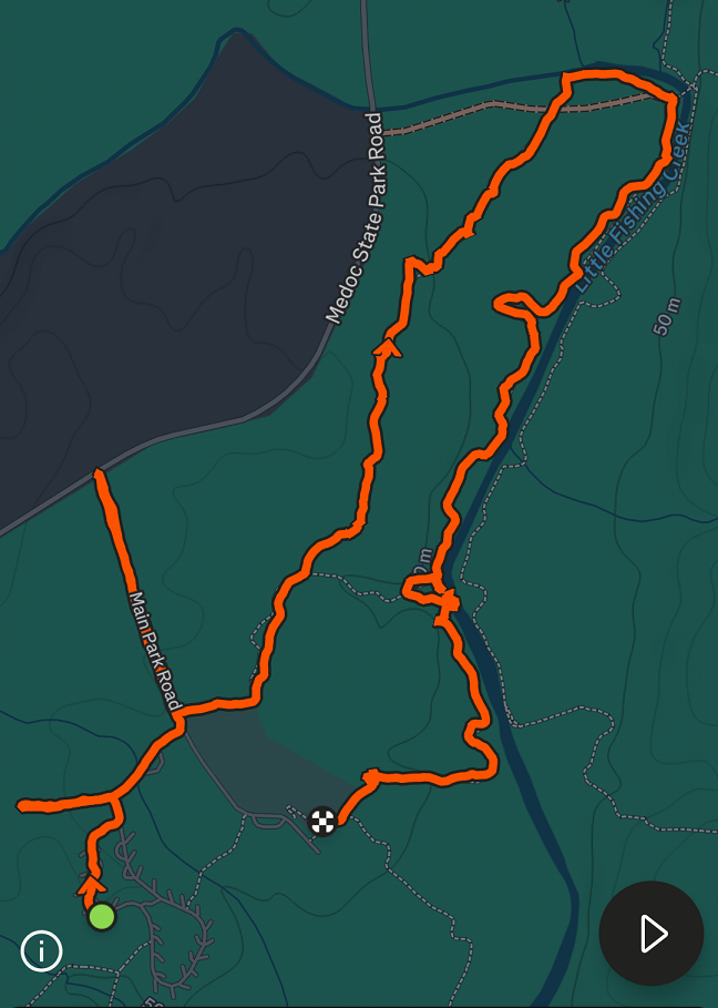 Aiken and I left the campground, jogged by the group camping area, and then went to the end of Main Park Road (or Picnic Area Road, depending on which map you’re looking at?). Where it intersects with Medoc State Park Road, we turned around and headed back down Main Park Road. We took a left at the first field entrance and picked up the Stream Loop in the corner. Eventually, we found the Fishing Creek Loop Trail and took that until we ran into the Stream Loop again. From the picnic shelter/playground, we walked back to the campsite. I think we jogged about 3.5 miles.