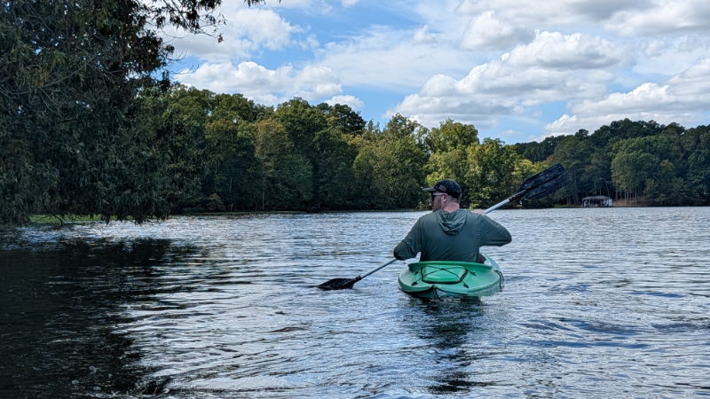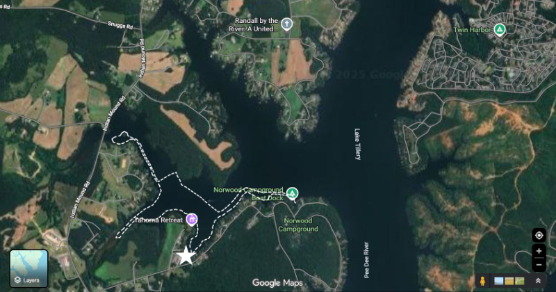 Below is a screenshot of a part of the lake. The white star is Norwood Access Area, where we began and ended our kayak adventure. The dotted line is the route we took, traveling clockwise. The green circle near the end of our trip is the campground’s lake access area.