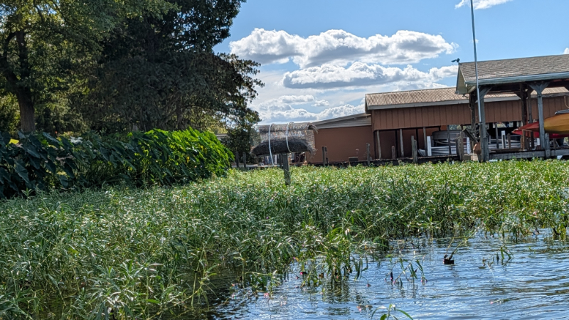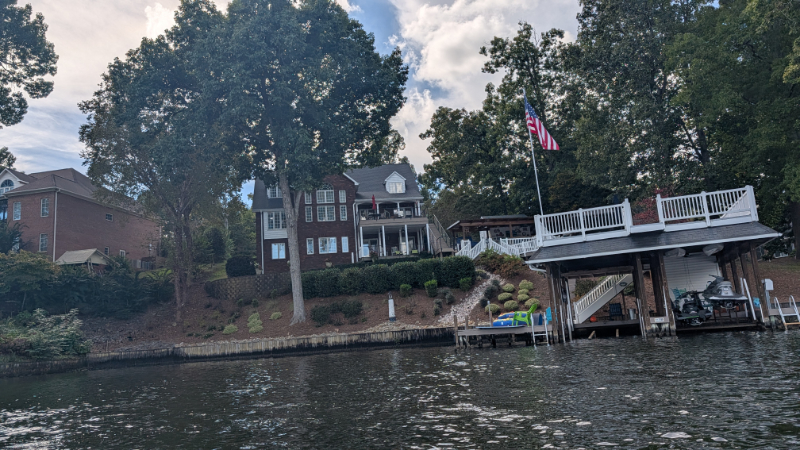 There were so many birds! We saw great blue herons, egrets, kingfishers, and a green heron (photos in the Wildlife section of this post). There were also turtles and lots of fish. We stayed close to the shoreline for the most part, in part to stay out of the way of the bigger, faster boats that are using the lake, and in part because it was fun to look at all of the houses and docks on the lake. This is one of my favorites.