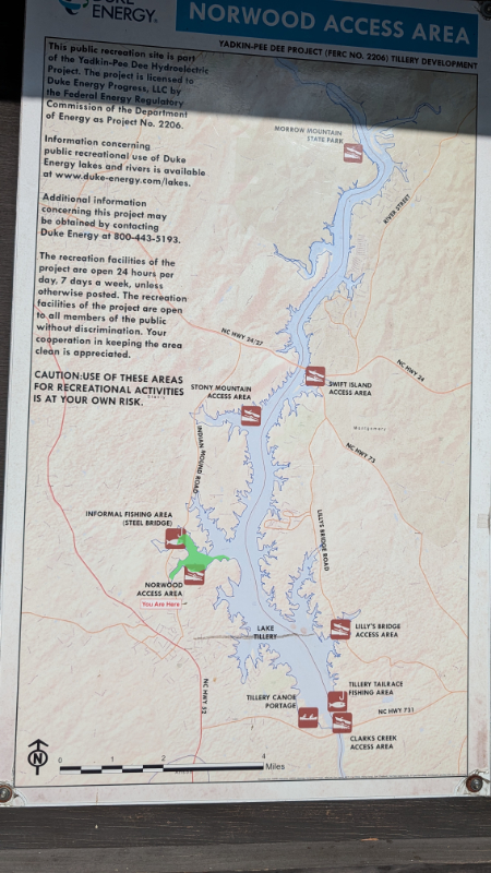 It felt like we were kayaking for a long time, but when you look at the places we explored, you get a feel for how big the lake is (and how little we saw). The image below is a photo of a map of Lake Tillery. The small green section toward the lower half of the image is the area we expored with the kayaks.