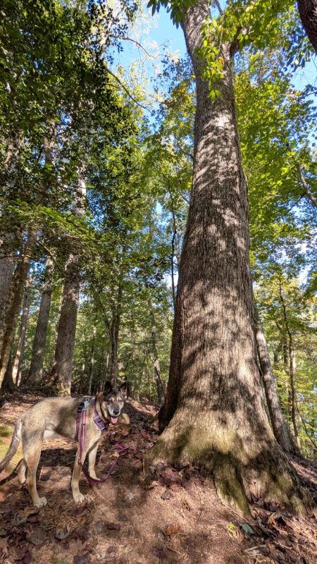 We started the trail at the southeast corner near the boat ramp and hiked the loop clockwise, ending at the restrooms/boat rental area. The good thing about hiking in this direction is that you end your adventure along the Yadkin River. There are a few spots with good water access, and the dogs were only too happy to wade around in the water after a few miles of hiking.