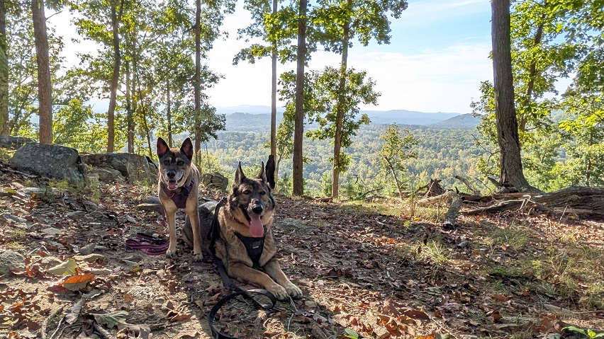 At some point, you get to a spot that overlooks the Yadkin River. This is where the treacherous terrain comes in, because you need to get down those rocks to get closer to the river. By that point, Corona had already hiked about 4 miles (as this part is not included in the 4.1-mile calculation for the trail distance). She’s also 13 years old and those rocks were really more like boulders, so we elected to stay at the top and watch as Jesse and Aiken made their way down. In the photo below, you can barely see them on a rock near the water since they’re so tiny.