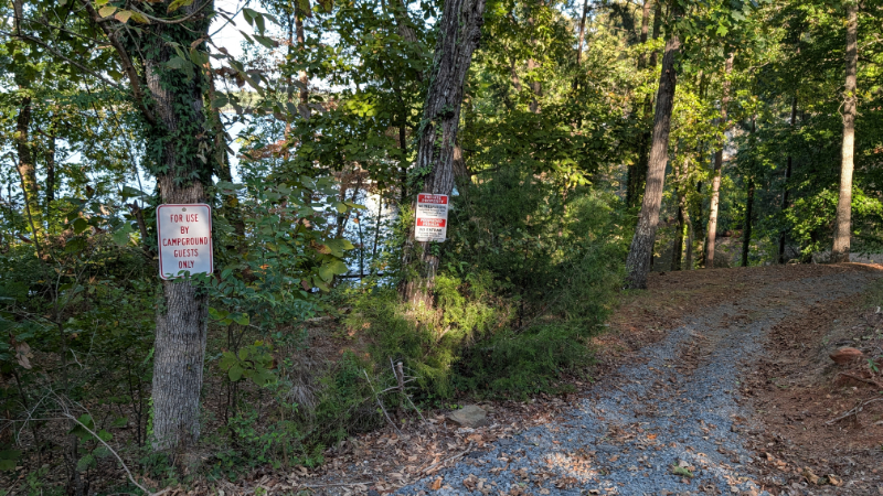The campground isn’t actually on the lake; it’s on the other side of the road. However, they have a piece of property on the lake side that does go down to the lake. Since it’s only for those staying at the campground, it’s kind of like having private access. The gravel driveway (for lack of a better word) is steep, and I don’t think you’re supposed to drive on it, but it works.
