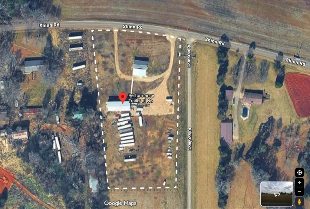 It took us almost an hour, but we made it. The shop sits on a large piece of land on a residential road. It was open and quiet. The owner doesn’t have pets, so it was a perfect place to get the dogs out after hours of driving. Below is a screenshot from Google Maps of the property. We put Aiken on a 20-foot leash and were able to play fetch with him in the open space toward the back of the property.