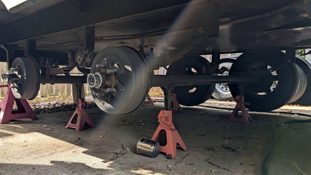 First, we got the entire RV up on jack stands so the tires were off the ground. Then we got both axles on jack stands. We removed the wheels and tires.