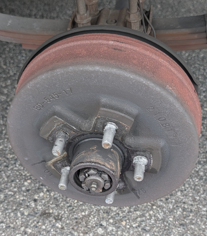 Next, we removed the hub assembly (to take some weight off the old axles and make them easier to move. We removed the bolts to disconnect the axles from the rest of the trailer.