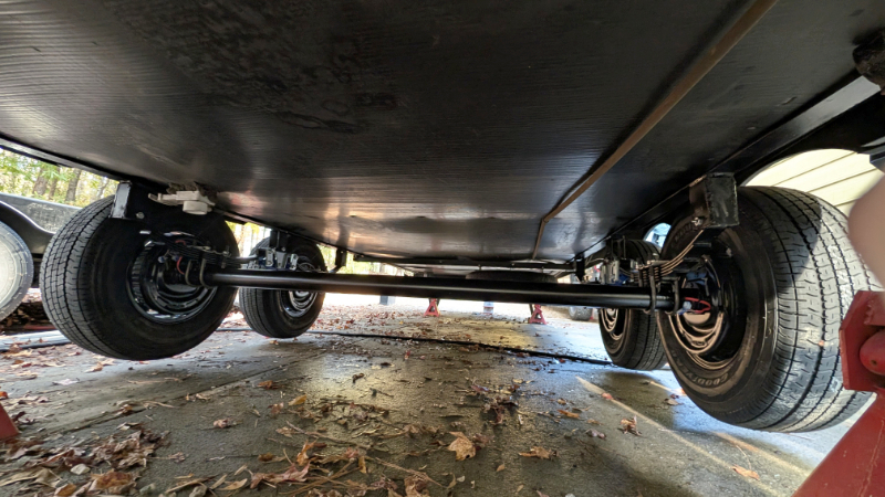 Here is a photo of the underside of the RV with the new axles in place and tires mounted.